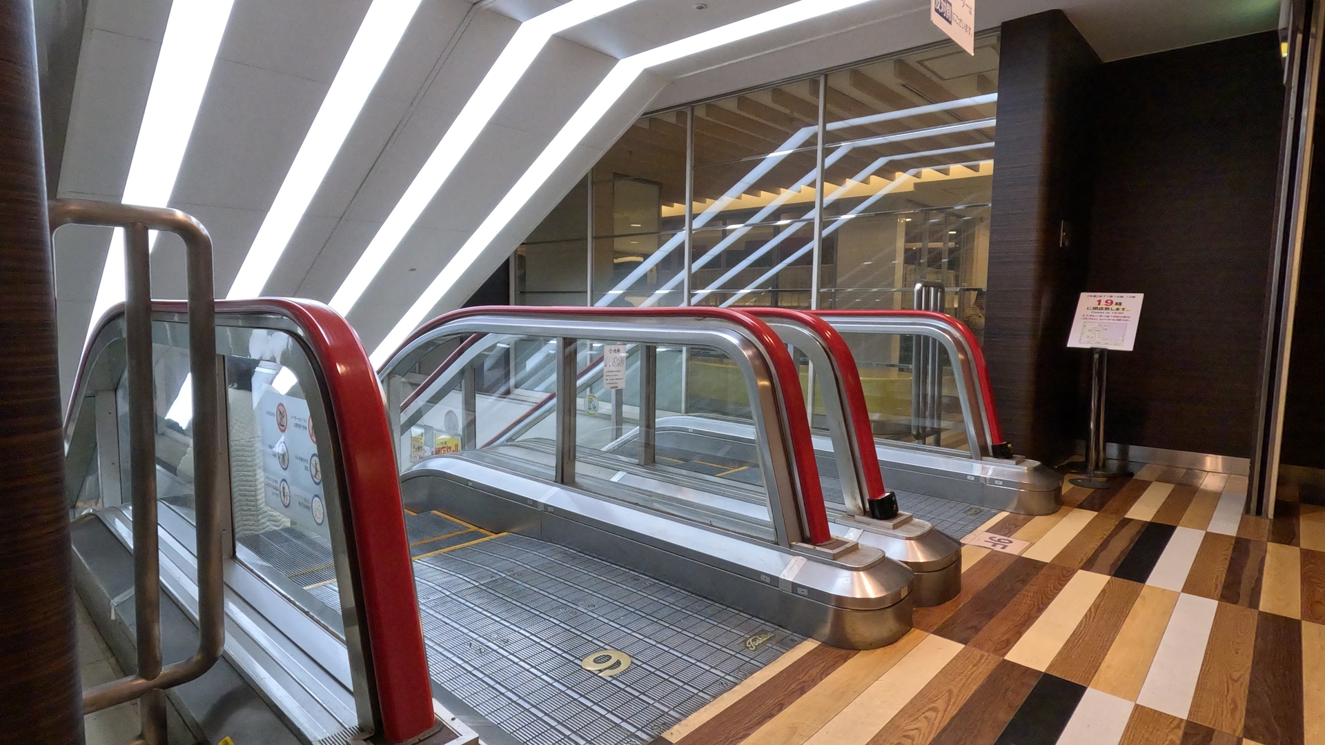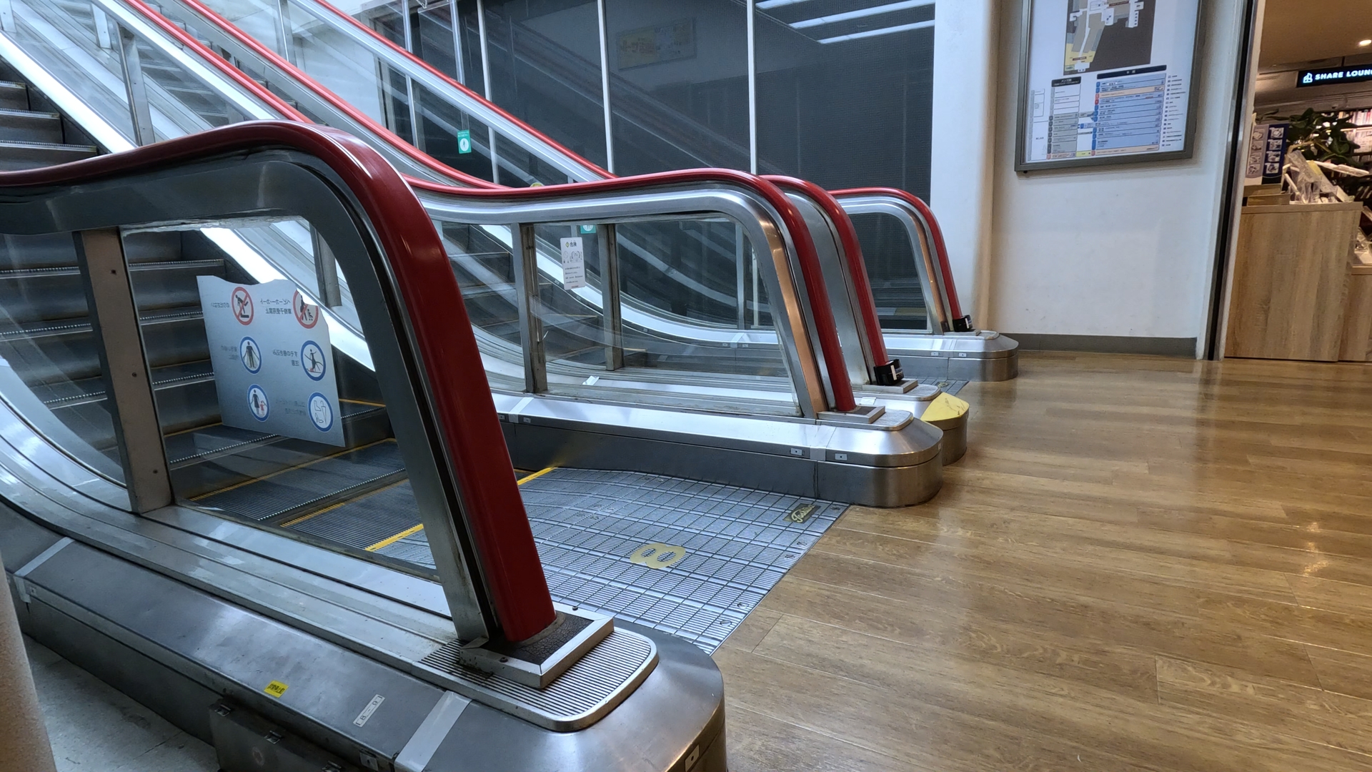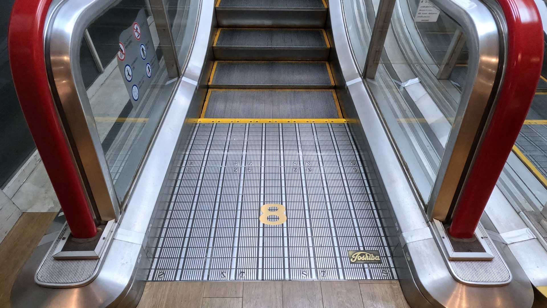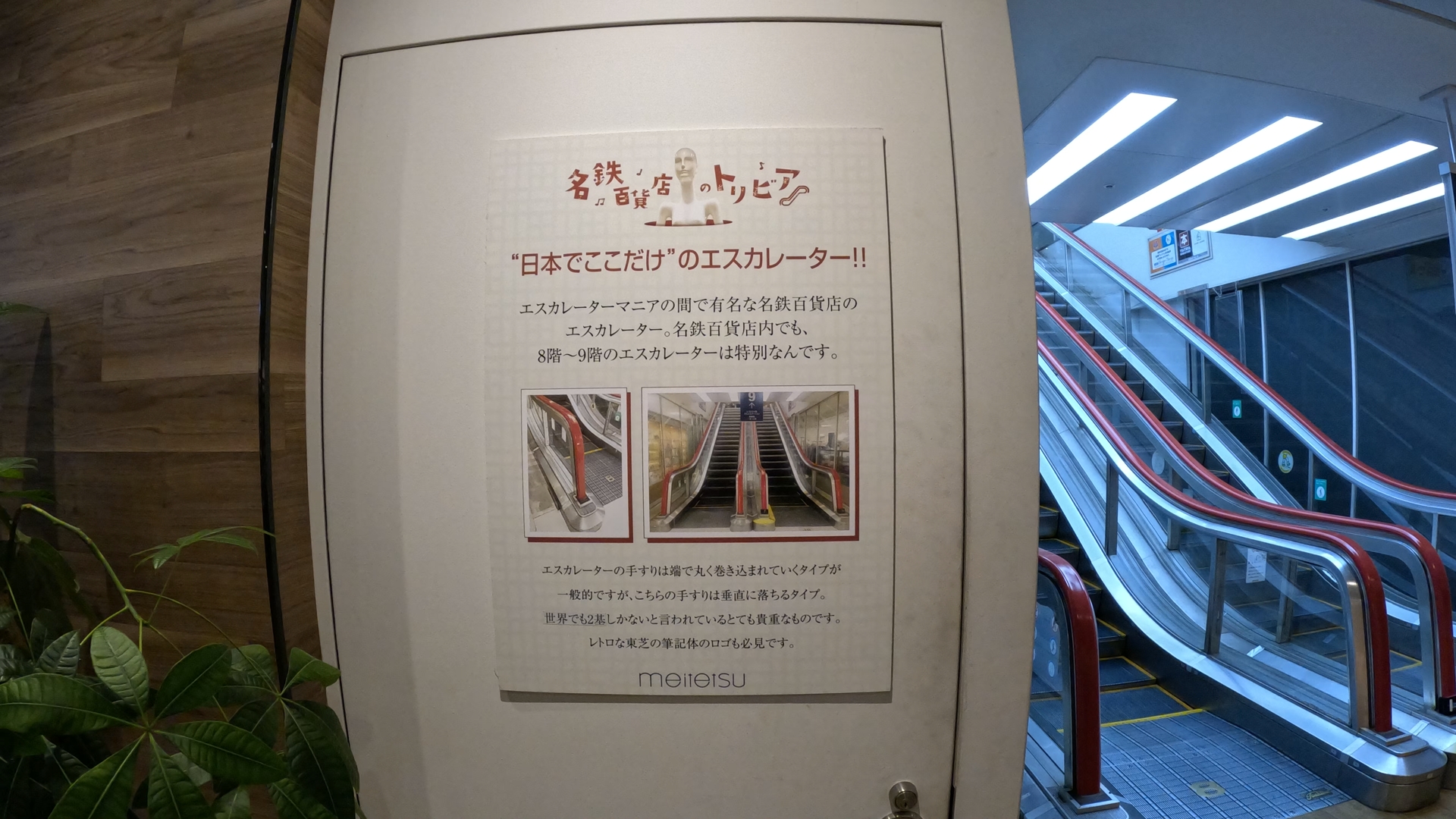 OTIS ESCAL-AIREなど、超貴重なエスカレーターの集う名鉄百貨店の高層階、レストラン街入り口には、日本で3基しかない東芝の垂直落下手すりが2基。もう1基は日比谷に。