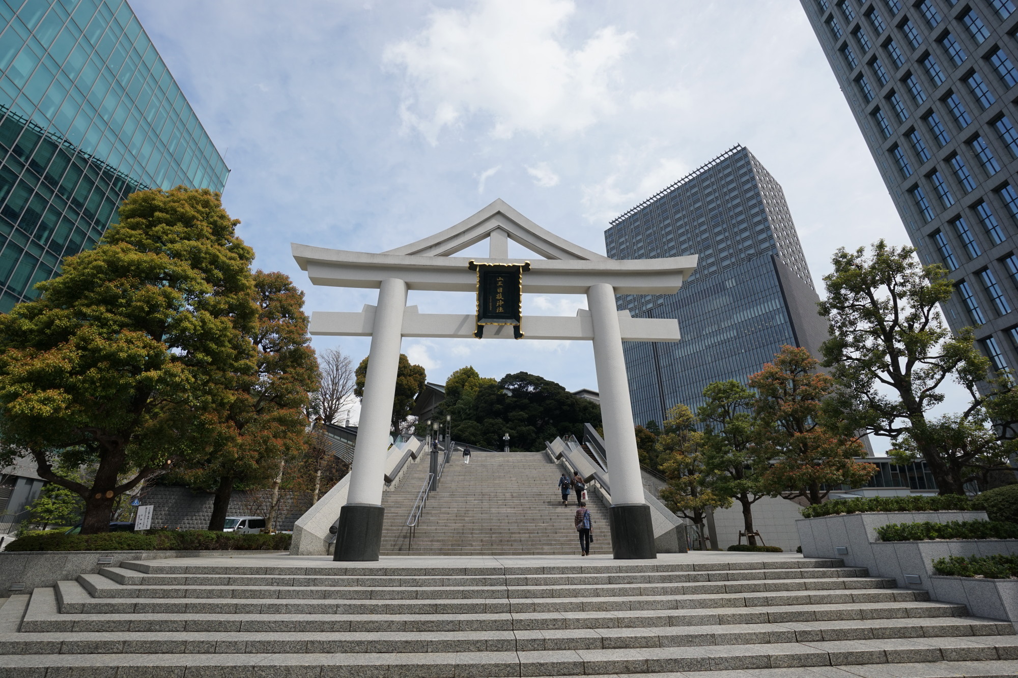 ビルの隙間にある神社。参道にしっかりとエスカレーターがとても都会的。2基目はステップひとつずつの高さが低い緩傾斜型。3基目の小さいやつもかわいい。