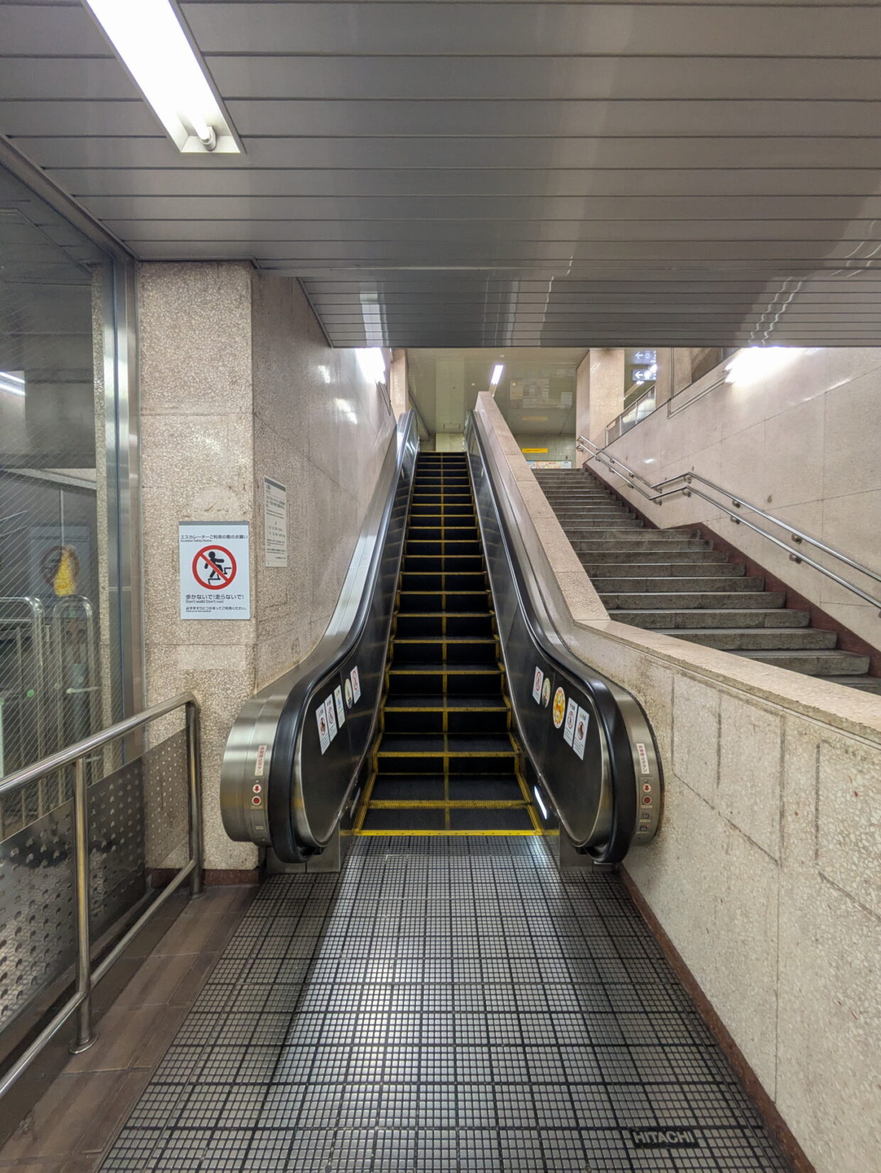 ステップの真ん中に線がある。「片側を開けて乗りましょうね」と推奨していた時代の名残。