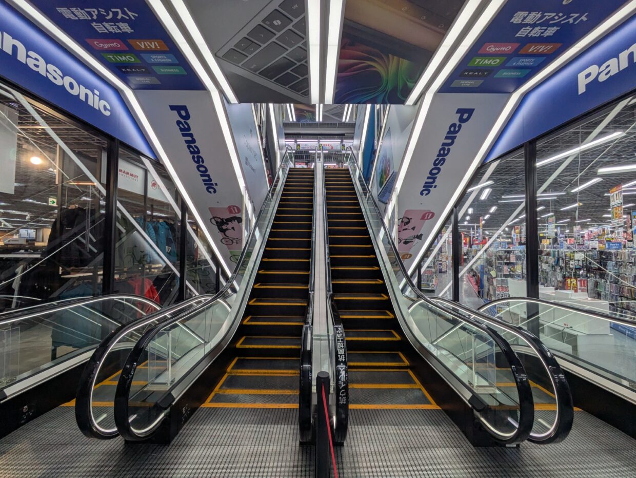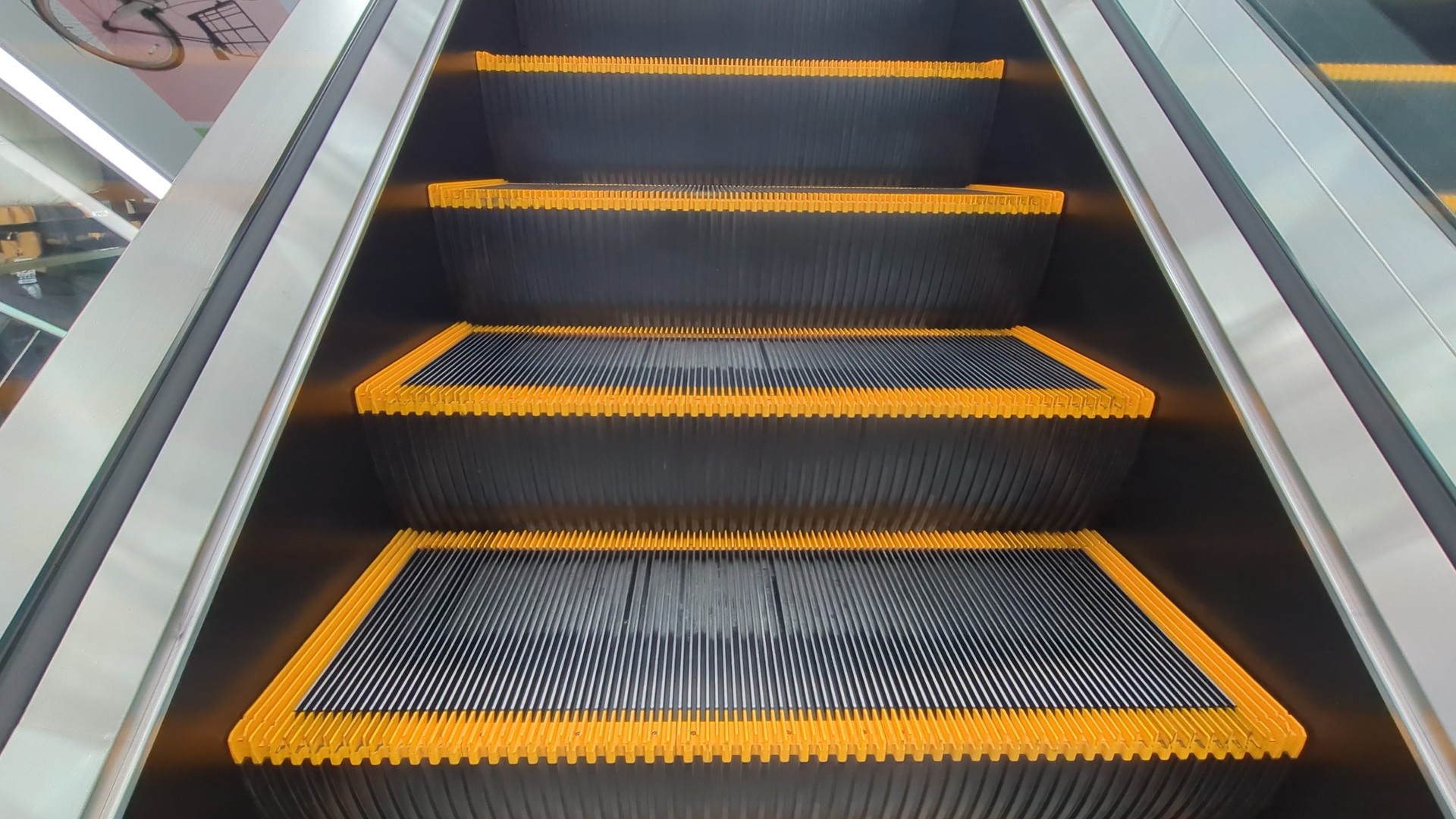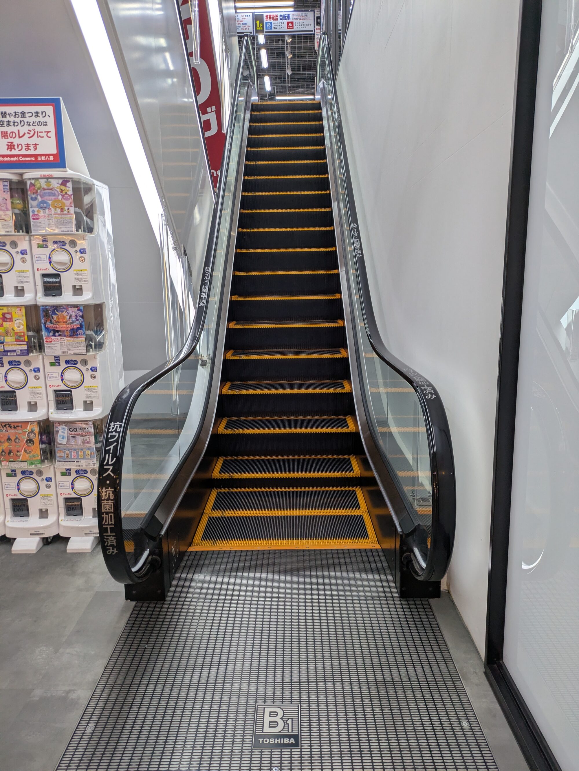 東芝の最新型エスカレーターがある。ステップの手前にもデマケーションラインがあるタイプ。