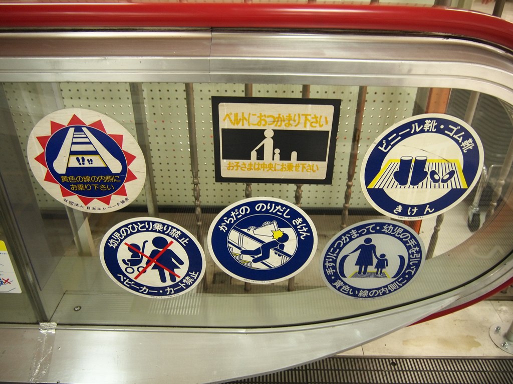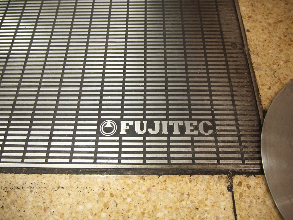 フジテックの富士山マークのロゴがついたやつ。全種類あるんじゃないか?ていうぐらい、エレ協の丸型ステッカーが貼ってある。